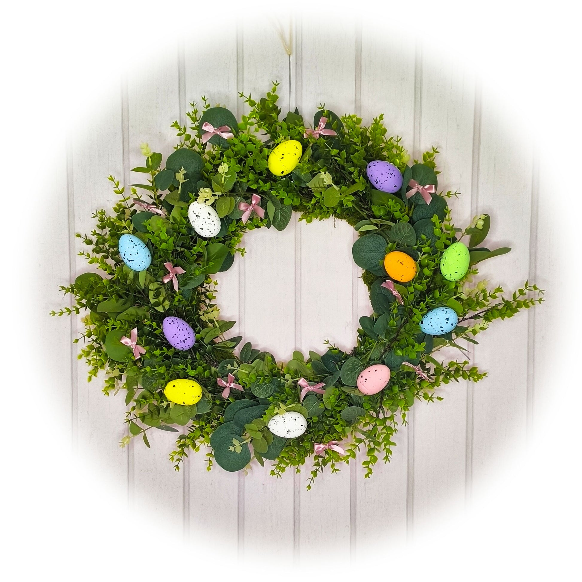 Delikatne połączenie eukaliptusa i bukszpanu z kolorowymi pisankami i subtelnymi, różowymi kokardkami tworzy wyjątkowy, wiosenny klimat. Zdobienie to idealnie wpasuje się w atmosferę Świąt Wielkanocnych, wprowadzając radosną i świeżą aurę do każdego wnętrza. Wianek jest perfekcyjnie wyważony, z dbałością o szczegóły, a jego wiosenne akcenty z pewnością przyciągną uwagę i staną się piękną ozdobą na drzwiach czy stole.